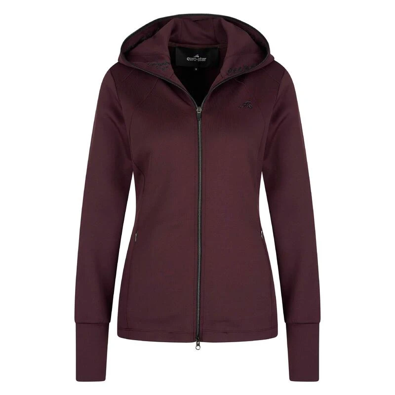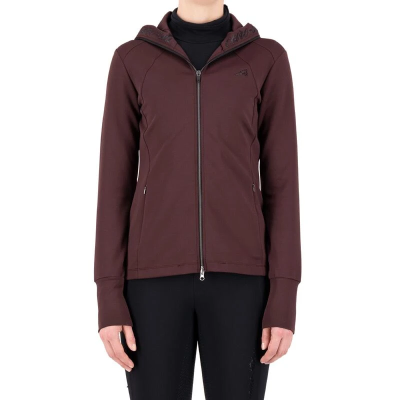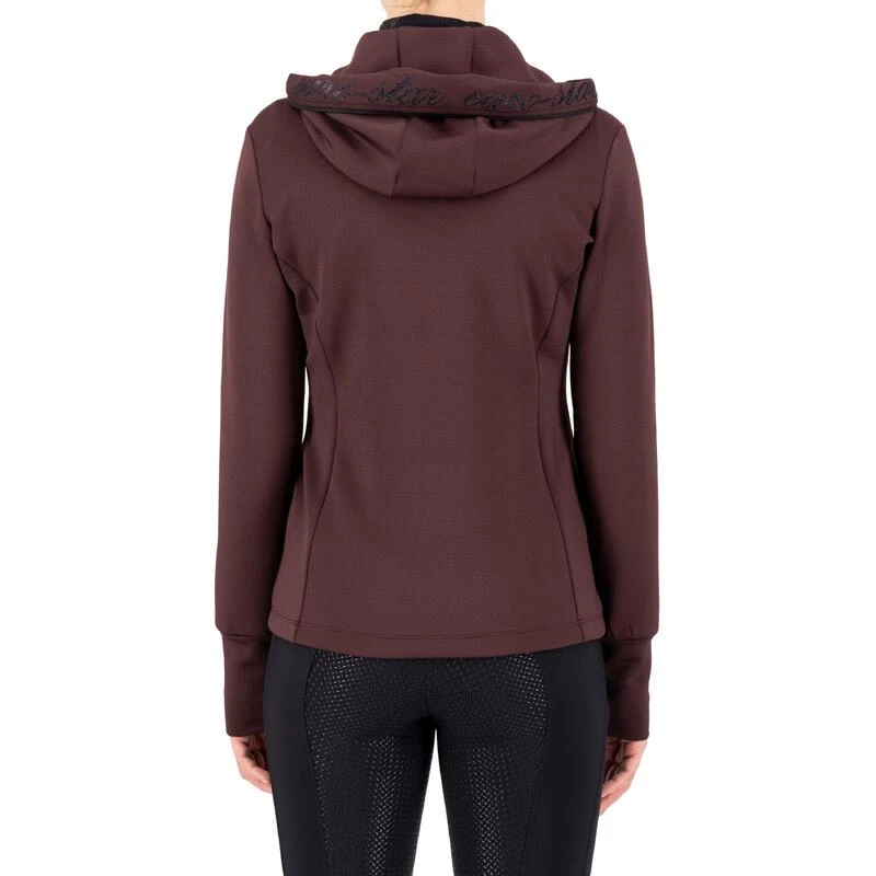 Un sweat à capuche élégant pour les cavalières avec une fermeture éclair à double sens et un logo en strass de tête de cheval.